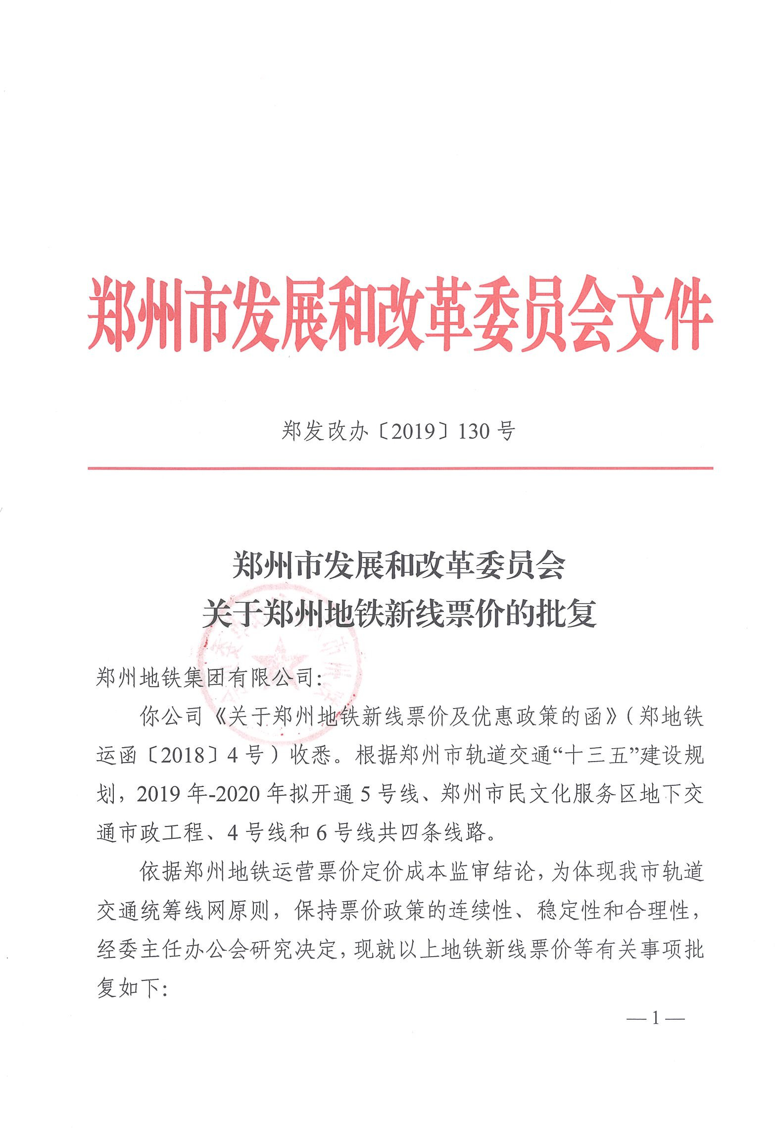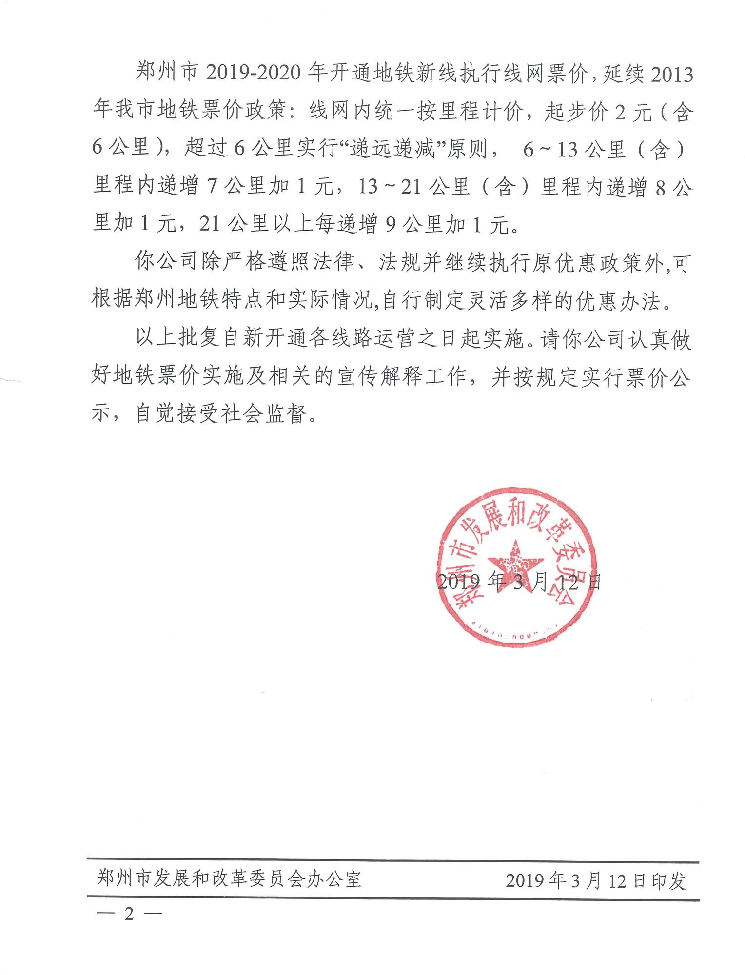 鄭州市發展和改革委員會關于鄭州地鐵新線票價的批復