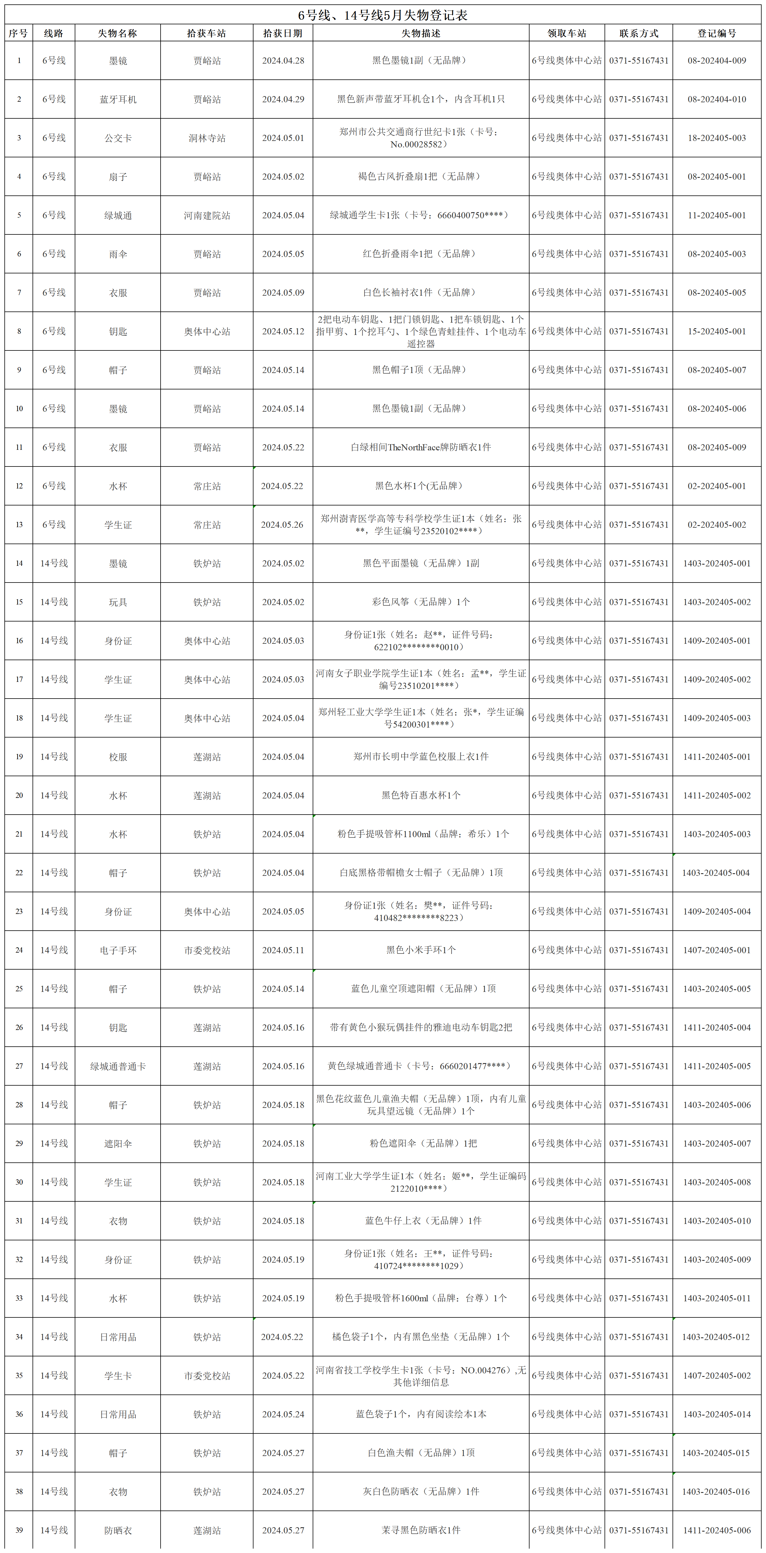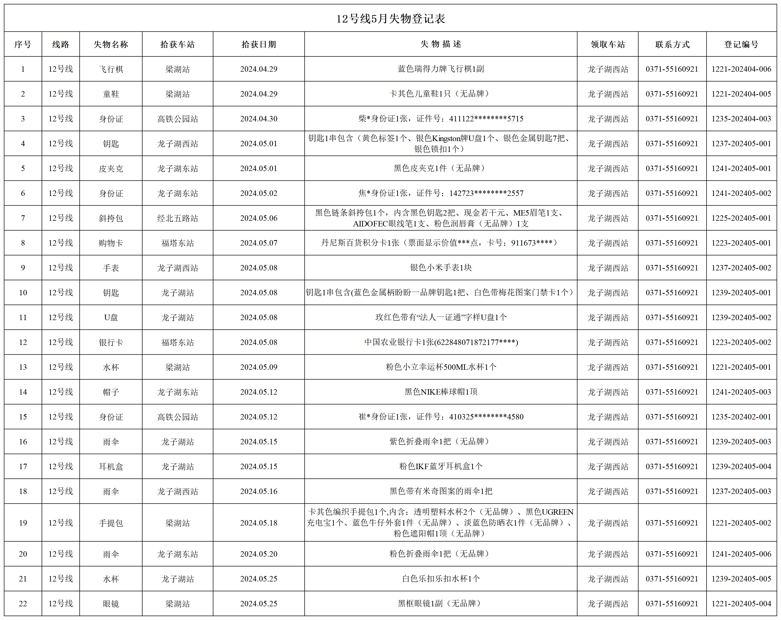 2024年4月28日—2024年5月28日車站無人認領失物情況