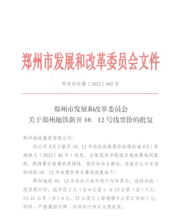 鄭州市發展和改革委員會關于鄭州地鐵新開10、12號線票價的批復